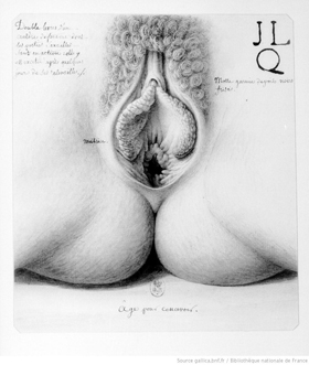 The architect Lequeu is one of the three leading exponents of the Revolutionary architecture, a movement representing a part of the neoclassicism in France. A great number of monumental buildings and quarters were designed, but almost none of the designs was realized. The series "Figures Lascives" consists of obscene and bizarre drawings depicting male and female genitals. The eye-catching fact in this drawing is the detailed and entire depiction of the female genitalia. The artist depicts inner and outer vaginal labia, vaginal opening, clitoris and pubic hair. The vulva however ist not depicted in a naturalistic way. Some of Lequeu's architectonic designs are full of sexual energy and make viewers think of vulvas. The following analogy thus is the result of comparing an architectural drawing with the vulva: the vagina represents the entry of the cave, the pubic hair symbolizes the vegetation, the vaginal labia symbolize the cliff. Sexual aesthetics is omnipresent in all his architectural designs. Here he considers the vagina as a symbol for the cave. A remarkable fact is that this picture had been drawn before Courbet painted "The Origin of the World" in 1866. After Lequeu's death, the series has been given to the National Library of France, who exhibited it for the first time in 2007/2008.[1] We can take for granted, that in the 18th century these drawings were not revealed to the public. Biography: http://de.wikipedia.org/wiki/Jean-Jacques_Lequeu (Translation: K. .Seifter)